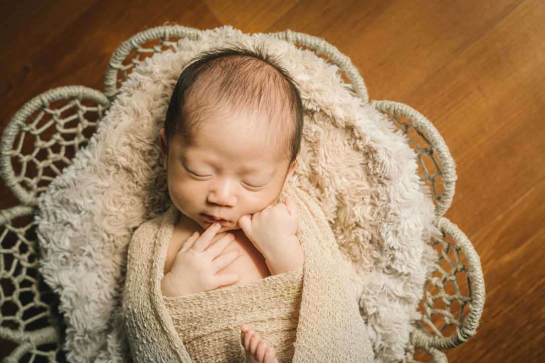 赤ちゃんを寝かしつけ、 おくるみを巻いて 撮影準備を進めます。